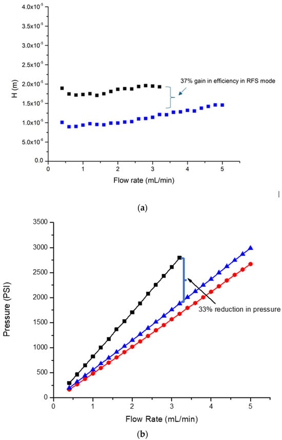 (a): HETP curves and (b) pressure vs. flow rate curves, comparing the conventional mode (black line and black markers), 15% RFS mode (red line and red markers), and 30% RFS mode (blue line and blue markers). The bracket in (a) shows the 37% gain in efficiency obtained when using RFS compared to the conventional mode. The bracket in (b) shows the 33% pressure reduction obtained when using the conventional mode and the 30% RFS mode.