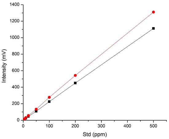 Calibration curves of caffeine for the RFS (red circles) and conventional (black squares) modes.