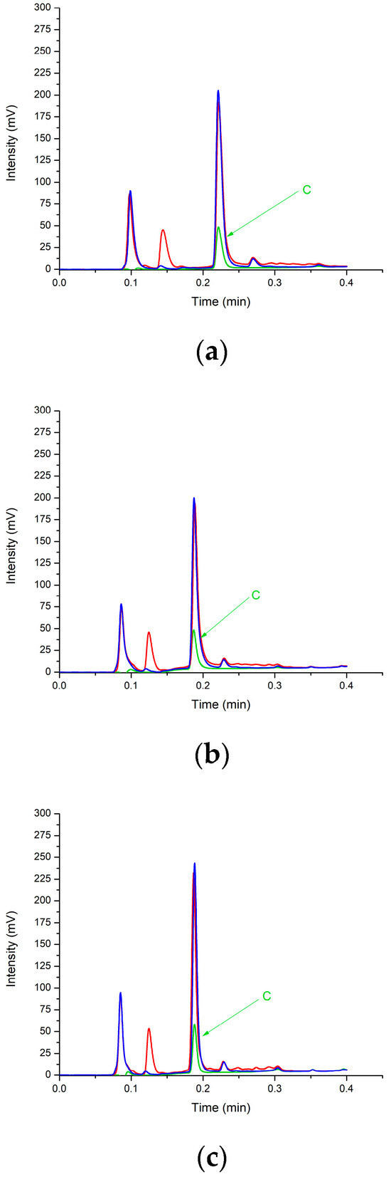 Chromatograms of the Red Bull Green Edition sample (red trace), Red Bull Purple Edition sample (blue trace), and 20 ppm caffeine standard (green trace, with C representing caffeine peak). (a) The separation achieved using the conventional run column, (b) RFS mode at a 15% segmentation ratio, and (c) RFS mode at a 30% segmentation ratio. Detection was set at 254 nm.