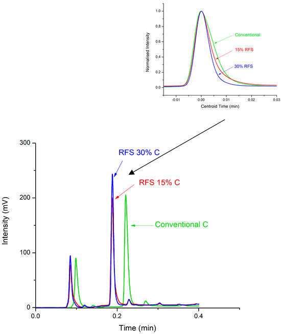 This is detailed further in Figure 5, which compares the separation of the Hemp sample. The insert in Figure 5 is an expanded, peak height-normalised profile of the caffeine peak for each mode—overlaid with respect to each peak’s first moment (retention time). These normalised peak profiles show that the peak width obtained using the RFS mode (30% split to the detector) was significantly reduced by 28% compared to that using the conventional mode under gradient conditions, in which peak width reductions are already assisted by gradient compression effects [32]. The results obtained under gradient elution conditions are in line with the improved isocratic theoretical plate/column efficiency of up to 37% observed in the HETP curves (Figure 1) when the column operated in RFS mode compared to the conventional HPLC column. Hence, the improved column efficiency translates to better separation performance in real samples separated under gradient conditions, as shown.