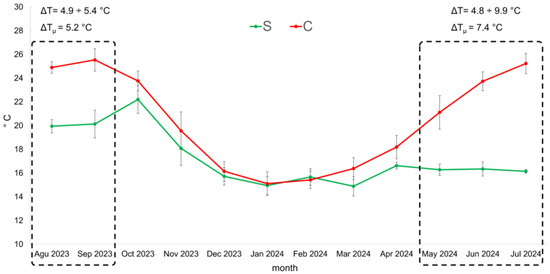 Temperature evolution measured with a probe inserted in the bottle cap during the 12 months of underwater aging (S) and cellar aging (C). ΔTμ represents the average temperature variation during the months with the highest temperature fluctuation (August–September 2023; May–July 2024).