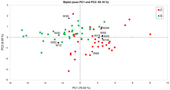 The results indicate a partial separation between S and C samples, with the first two principal components explaining 76% and 9% of the total variance, respectively. However, a partial overlap is observed between the two groups along the PC1 axis, suggesting that some samples share similar characteristics in relation to the variables that contribute most to this axis. The PC2 axis also contributes to the separation, although to a lesser extent.