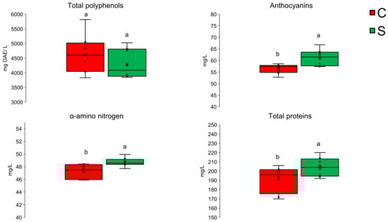 Concentrations of total polyphenols, anthocyanins, free alpha-amino nitrogen, and total proteins in underwater-aged and cellar-aged liquors. Different letters indicate statistically significant differences (p ≤ 0.05).
