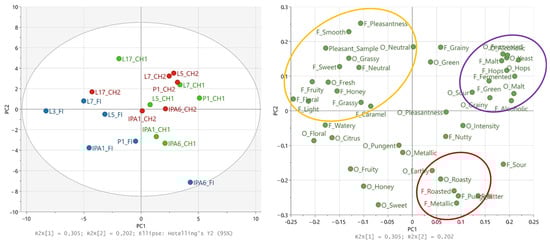 Principal component analysis based on the citation rates from check-All-That-Apply (CATA) descriptors used to characterize non-alcoholic beer samples in three sensory tests (Table 2). Scores and loading plots for samples (n = 18) and variables (n = 40) studied in all sensory tests (blue: Finnish participants FI, green: Chinese group 1 CH1, red: Chinese group 2 CH2). L: lager, IPA: Indian pale ale, P: pilsner, O_: odor attribute, F_: flavor attribute, F/O_: Pleasantness flavor or odor ratings for pleasantness (Table 3), Pleasant_: frequency of sample chosen as the most pleasant sample. Orange, purple, and red ovals indicate grouping of variables.