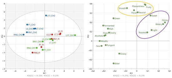 Statistically significant differences between samples rated by FI were observed in seven RATA descriptors (Table S3), whereas only five were rated by CH1 and four rated by CH2. ‘Fruity’ was the only descriptor, which was statistically different between the samples for every group. The most ‘Fruity’ samples were L3 (FI) and L17 (CH1 and CH2). Even though, IPA6 was rated as the most ‘Bitter’ sample by every group, it was not statistically significantly different compared to other samples as rated by CH2. However, IPA6 was statistically significantly more bitter than every other sample, except P1 by FI and P1 and IPA1 by CH1. L3 and L17, the samples which were most often chosen as the most pleasant ones, were the least bitter, sour, malty, and alcoholic samples, whereas they were the most intensively fruity.