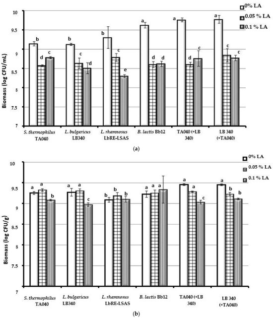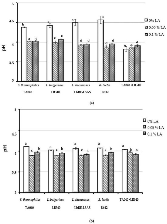 In the yogurt beverages (Figure 2b), the acidifying activities of all strains were high: 4.02 to 4.10 in the absence of LA (controls) and 3.88 to 3.90 and 3.91 to 3.97 in the presence of LA at 0.5 and 1 mg/mL, respectively.