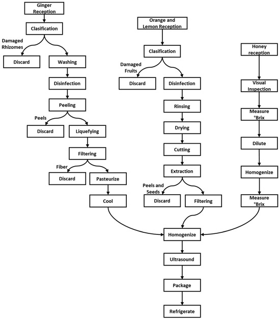 The beverage was made following the process flow chart in Figure 1; the stages are described below. The fruits, such as oranges and lemons, were immersed in potable water for washing and then rinsed in water with a 10 ppm chlorinated solution to eliminate microorganisms and organic residues. A total of 35 kg of orange fruits and 52 kg of lemon fruits were used, from which the juice was extracted by a manual mechanical process using a stainless-steel instrument (Manual Juicer, Jinhua, China) and passed through a filter using a fine mesh (Able Brewing, Kone Filter, Portland, OR, USA) with a size of 100 μm; finally, the orange juice (OJ) and lemon juice (LJ) were refrigerated at a temperature of 5 °C and stored in glass containers until the formulation of the beverage.