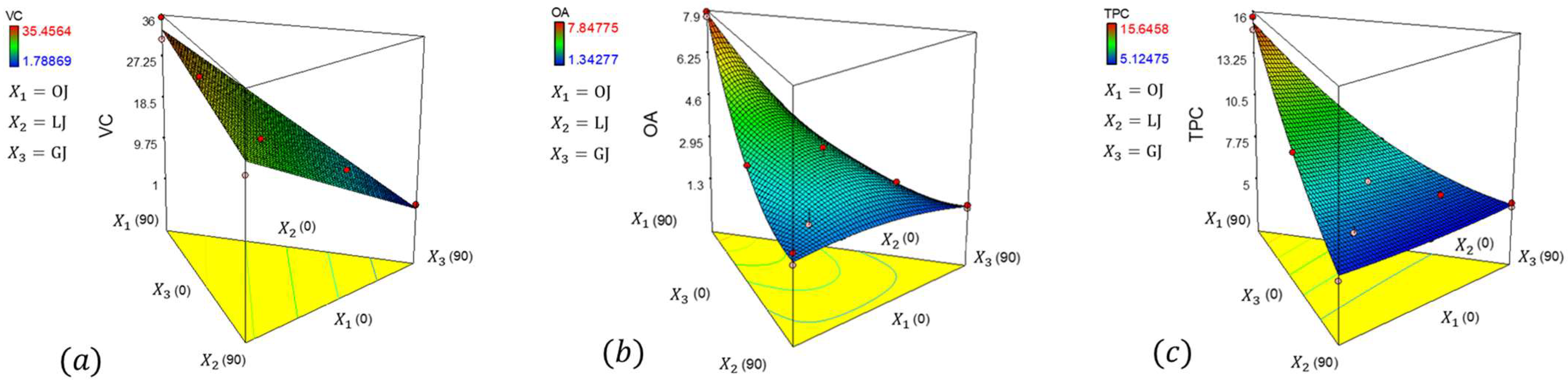 The mathematical models developed for the three response variables demonstrated a high degree of fit, as evidenced by their coefficients of determination (R2) and adjusted coefficients of determination (R2 adj). The model for TPC presented the best fit with R2 = 0.9932 and R2 adj = 0.9883, followed by the model for OA (R2 = 0.9886, R2 adj = 0.9773) and VC (R2 = 0.9612, R2 adj = 0.9534). These values indicate that the models are highly significant and have a robust predictive ability for the variables studied. The high significance of the linear terms in all response variables suggests that the individual properties of each component exert a predominant influence on the final beverage characteristics. Significant binary and ternary interactions in OA indicate that combinations of components can modulate the acceptability of the product, a crucial factor for its potential marketability. Overall, the models were good at predicting the response outcomes. Figure 2 shows the geometric representation of the independent variables as a function of the responses.
