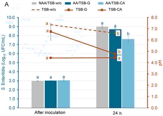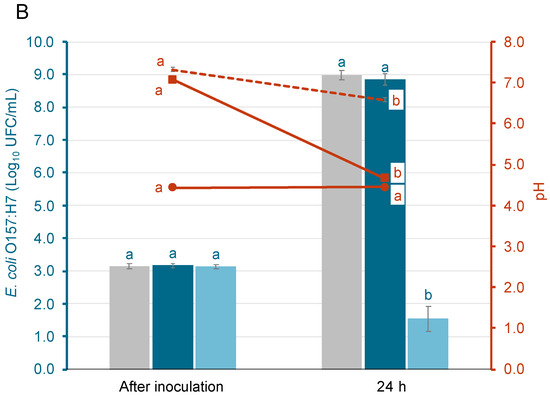 Figure 1 shows the growth of S. Enteritidis and E. coli O157:H7 in different acid-adaptative media, along with the mean pH values at initial time and after 24 h at 37 °C. Populations after inoculation ranged from 3.0 ± 0.1 to 3.1 ± 0.1 log10 CFU/mL. For S. Enteritidis (Figure 1A) and E. coli O157:H7 (Figure 1B), the populations after 24 h in the TSB-w/o and TSB-G media increased significantly, reaching levels that ranged from 8.7 ± 0.2 to 9.0 ± 0.2 log10 CFU/mL. On the contrary, in the TSB-CA media, only the population of S. Enteritidis grew, reaching levels around 7.6 log10 CFU/mL. The population of E. coli O157:H7 in the same media decreased by 1.6 ± 0.3 logarithmic units. The pH in the TSB-w/o media was only reduced by 0.7 ± 0.1 in S. Enteritidis and E. coli O157:H7 samples after incubation. Meanwhile, in the TSB-G media, the pH decreased by 2.4 ± 0.1. The pH of the TSB-CA media remained stable in all samples. As shown in Figure 1, bacterial growth was supported in TSB-G but not in TSB-CA, particularly in the case of E. coli. This initial evaluation aimed to identify appropriate conditions for acid adaptation. Based on these results, TSB-G was selected for subsequent assays, as it allowed sufficient growth and potential for adaptation, while TSB-CA was excluded due to the lack of bacterial growth.