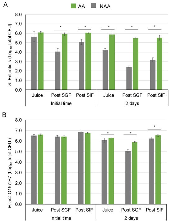 For E. coli O157:H7, there were no significant differences between AA and NAA bacteria after inoculation in orange juice, post-SGF SGF and post-SIF at the initial time. In both AA and NAA E. coli O157:H7, a slight increase in population was observed after gastrointestinal tract simulation, reaching a population of almost 7 log10 CFU. After 2 days, the AA and NAA E. coli reduced less than 0.5 logarithmic units in orange juice. Regarding gastrointestinal simulation after 2 days, the population of NAA cells reduced by 1.0 ± 0.2 logarithmic units in the SGF meanwhile lower decrease was reached for AA cells (0.4 ± 0.1 logarithmic units). At the end of the gastrointestinal tract simulation, the AA cell population increased around 0.2 logarithmic units compared to the initial population, but NAA cells maintained around initial population levels at 2 days.