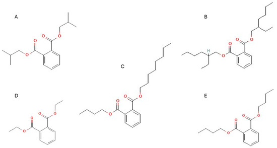 Molecular structure of (A) diisobutyl phthalate (DiBP), (B) bis(2-ethylhexyl) phthalate (DEHP), (C) butyl octyl phthalate (BOP), (D) diethyl phthalate (DEP), and (E) dibutyl phthalate (DBP).