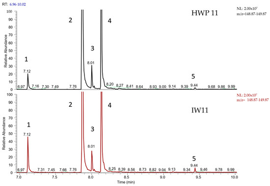Extracted ion GC/MS chromatogram of purified water sample HWP11 and the corresponding inlet water (IW11), showing a m/z 149 signal. The compounds eluted in the following order (increasing retention times from left to right): (1) diethyl phthalate at 7.12 min, (2) diisobutyl phthalate at 7.94 min, (3) butyl octyl phthalate at 8.01 min, (4) dibutyl phthalate at 8.21 min, and (5) di(2-ethylhexyl) phthalate at 9.44 min.