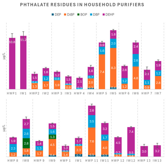 Phthalate residue levels (µg/L) in household water purifiers (HWPs) and corresponding inlets (IWs); error bars are related to the total phthalate residue.