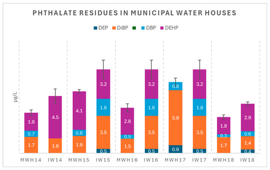 Phthalate residue levels (µg/L) in municipal water houses (MWHs) and corresponding inlets (IWs); error bars are related to the total phthalate residue.