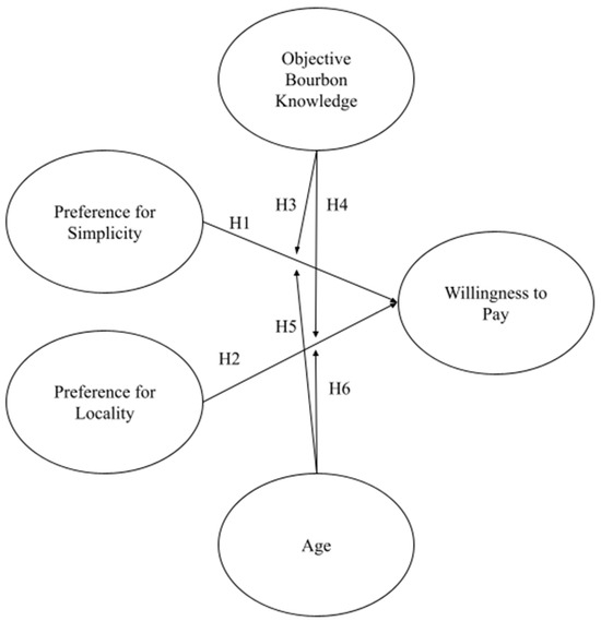 WTP represents consumers’ maximum monetary value assignment for goods or services, serving as a fundamental indicator of perceived product worth [13]. This is particularly relevant in the bourbon industry, where price points vary significantly based on product attributes and consumer perceptions. Contemporary research has extensively examined WTP in food [14,15] and beverage contexts [16,17,18], with particular emphasis on premium and sustainable products. Li and Kallas’ [19] meta-analysis of 80 studies revealed that WTP is influenced by demographic factors, regional differences, and sustainability attributes, with European and Asian consumers demonstrating higher WTP for sustainable products compared to North Americans.
