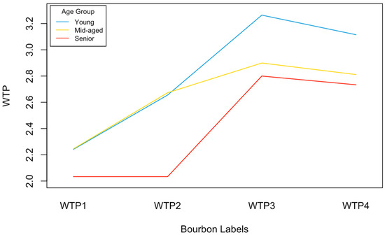 The mixed-design ANOVA examined how WTP for bourbon varied across different label designs and age cohorts. As shown in Figure 2 and detailed in Table 3, no substantial differences were observed across age groups for WTPLabel1, which indicated that the baseline label elicited similar consumer responses across younger, middle-aged, and senior adults. Regarding WTPLabel2, both younger and mid-aged adults reported higher WTP than senior adults (p < 0.05 and p < 0.01, respectively), with mean differences of −0.62 and −0.64. In contrast, complex designs such as WTPLabel3 and WTPLabel4 elicited more uniform responses across age cohorts. The result of mixed design ANOVA suggested that younger and middle-aged consumers are more responsive to specific label innovations compared to senior consumers.