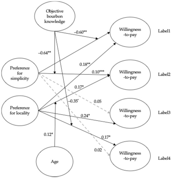 The result of the SEM is shown in Table 5. It revealed that consumers’ preference for simplicity is positively related to WTPLabel1 (β = 0.24, p < 0.05) and WTPLabel2 (β = 0.10, p < 0.001). However, neither the relationship between preference for simplicity and WTPLabel3 nor WTPLabel4 is statistically significant. Therefore, H1 is partially supported. Consumers who prefer concise labels indicated an overall lower WTP (i.e., USD 21–USD 30) when they are shown a bourbon under a complex design. Consumers’ preference for locality is found to be positively associated with WTPLabel1 (β = 0.18, p < 0.01), WTPLabel2 (β = 0.17, p < 0.05), WTPLabel3 (β = 0.24, p < 0.05), and WTPLabel4 (β = 0.17, p < 0.05). That is, H2 is completely supported. It is indicated that consumers favoring local products would possess higher WTP when the bourbon label mentioned information about the locality, such as “locally grown barley is used for ingredients”. The last column of Table 5 presents values of the variance inflation factor (VIF). Since both values are less than 5, the likelihood of collinearity is very minor [47].