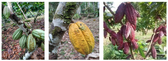 Ecuador is a region where cocoa is farmed by different communities such as Afro-Ecuadorian, Mestizo and Indigenous. All of them face the dilemma of the sustainability performance between fine flavour cultivars (collectively known as “Complejo Nacional” cultivars) vs. the most productive but less flavoured cultivars such as CCN-51 [12]. In 2011, The Iamoe Center started an experiment growing a native Amazonian cultivar of cocoa, commonly named “Nacional 801” or “Fino Pichilingue” and classified by the International Cocoa Germplasm Database as “EET-801” or “EETP-801” [13] relatively dispersed within a defined plot under the rainforest canopy. Aspects of its morphology are shown in Figure 1.