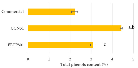 Total phenols content measured by the Folin–Ciocalteu method. (a) CCN51 vs. commercial (p < 0.01); (b) CCN51 vs. EETP801 (p < 0.01); (c) EETP801 vs. commercial (p < 0.01) according to Tukey HSD.