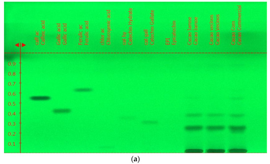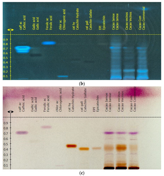 Representative HPTLC analysis of cocoa samples (mobile phase ethyl acetate/eater/formic acid/acetic acid (100:11:11:27): (a) no derivatisation, UV light (235 nm); (b) no derivatisation, UV light (366 nm); (c) derivatisation with 5% NPR + PEG4000, Vis light (380 to 750 nm). The three last lanes on the right are ETTP801 (“Cacao Iamoe”), CCN51 (“Cacao vecinos”) and commercial sample (“Cacao Commercial”).