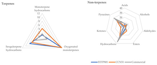 In terms of volatiles, all the samples show a spontaneous emission profile (Table 1), mainly rich in non-terpene derivatives, of which hydrocarbons and pyrazines are the most abundant groups. For EETP801 and CCN51, n-tridecane is the most represented volatile organic compound, whilst 2,3,5,6-tetramethyl pyrazine (TMP) is the most abundant volatile in the headspace of the commercial chocolate (Figure 4).