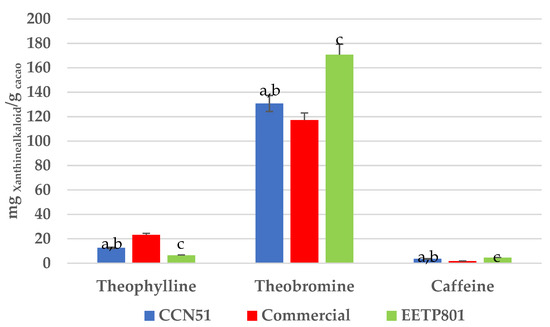 Concentration of xanthine alkaloids (mg alkaloid per gram of cocoa) in the samples. All values within each series are significantly different from each other (p = 0.01), according to Tukey HSD. (a) CCN51 vs. commercial (p < 0.01); (b) CCN51 vs. EETP801 (p < 0.01); (c) EETP801 vs. commercial (p < 0.01) according to Tukey HSD.