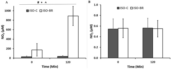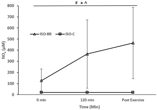 Plasma nitrate (A) and nitrite (B) responses after ISO-C and ISO-BR supplementation (n = 18). Data presented as mean ± SD. # Significant main effect of time (p < 0.001). * Significant main effect of drink (p < 0.001). ^ Significant interaction effect (p < 0.001). There was no significant difference in plasma nitrite between drinks.