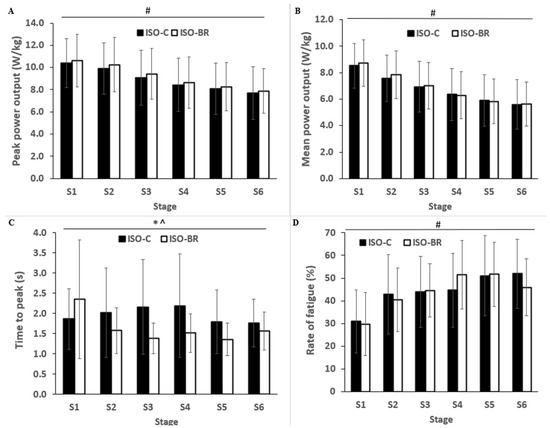 Peak power (A), mean power (B), time to peak power (C), and rate of fatigue (D) during SIE (n = 20) after ISO-C and ISO-BR supplementation. There was no significant difference in peak power, mean power and rate of fatigue between drinks. The average time to peak power was significantly reduced with ISO-BR supplementation compared to ISO-C. Data presented as mean ± SD. # Significant main effect of time (p < 0.05). * Significant main effect of drink (p < 0.05). ^ Significant interaction effect (p < 0.05).