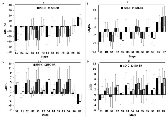 The ∆TSI (A), ∆O2Hb (B), ∆HHb (C) and ∆tHb (D) from baseline (n = 18) after ISO-C and ISO-BR supplementation. (C) ISO-BR had significantly higher ∆HHb than ISO-C supplementation (main effect of drink, p = 0.002, partial η2 = 0.02). Data presented as mean ± SD. # Significant main effect of time (p < 0.05). * Significant main effect of drink (p < 0.05). Table 3 shows the magnitude of the ∆TSI, ∆O2Hb, ∆HHb, and ∆tHb. The magnitudes of the ∆TSI, ∆O2Hb, ∆HHb, and ∆tHb for all the stages were not significantly different when comparing ISO-BR to ISO-C.