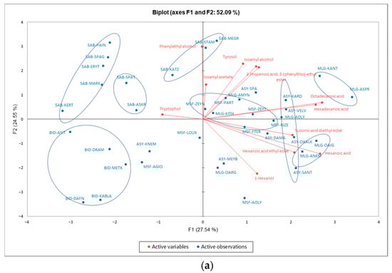 (a) PCA and (b) PLS-DA biplots of the initial variables that used on the analysis of 39 wine samples from 2019 and 2020 vintages. Blue circles in Figure 3a, indicate product clustering based on the chosen 12 volatile markers.