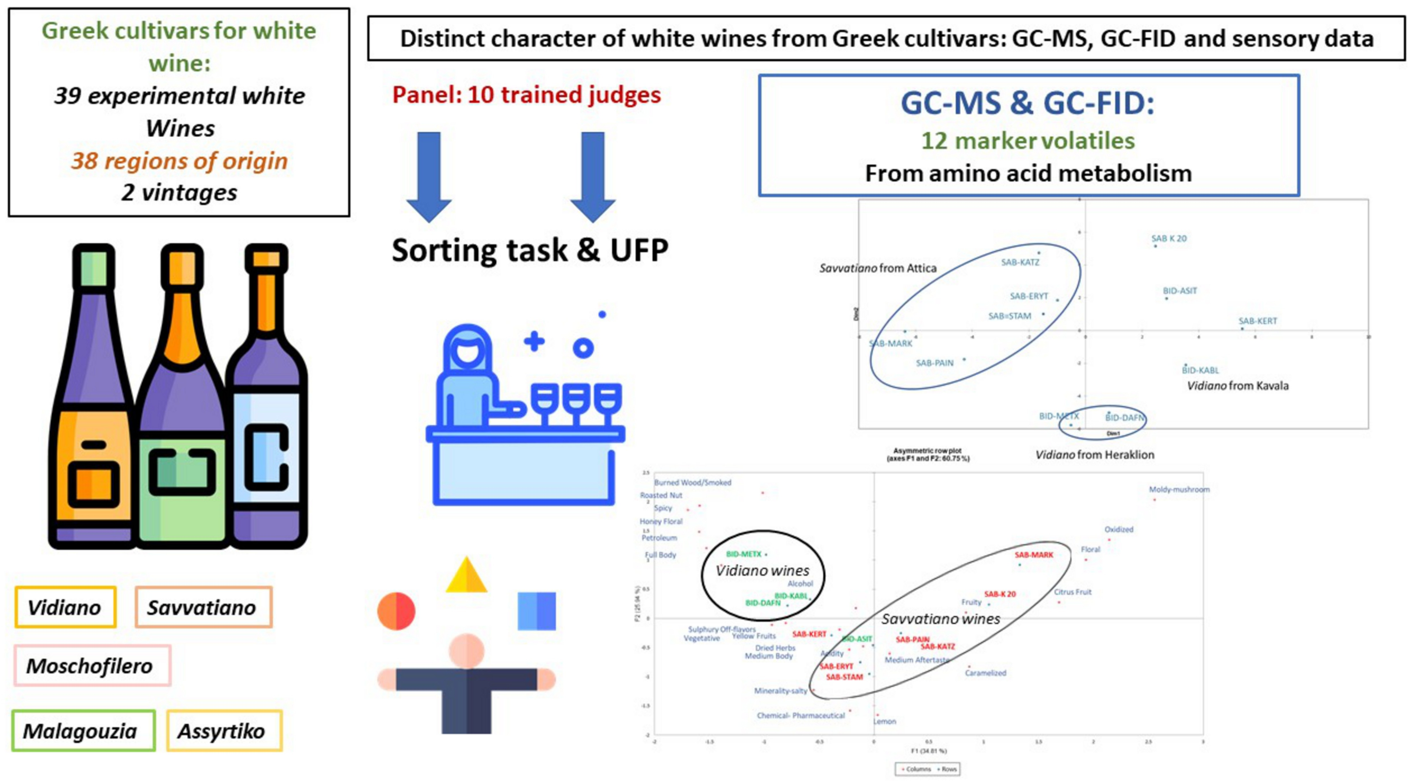 4], again most of the Malagousia wines were related to citrus and earthy odors. From comparison to those works with respect to the Malagousia grape, we could only find similarity to our findings as far as the nutty character was concerned but not so much on the earthy and citrus side. Nevertheless, we chose to profile the wines primarily by the sorting task, followed by Ultra Flash Profiling, rather than using the CATA method. Moreover, both above studies were aiming to characterize those unique Greek grape varieties based on their orthonasal aromas only, whereas in our case we let the assessors choose their descriptors based on what they found to be the most important in clustering and/or separating a product group from another when including all sensory flavor modalities in the assessment (namely ortho- and retronasal aromas, basic tastes, mouthfeel and aftertaste aspects).
