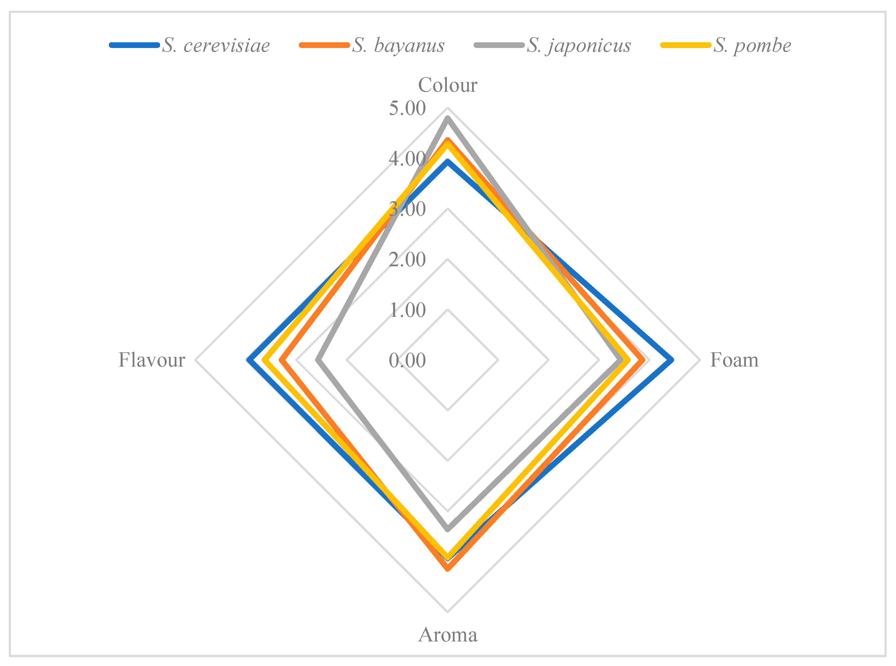 - Qin, X.; Li, F.; Bo, W.; Li, W.; Dong, X. The non-Saccharomyces yeasts as novel starter cultures to innovate beer brewing. CyTA J. Food 2025, 23, 2459819. [Google Scholar] [CrossRef]