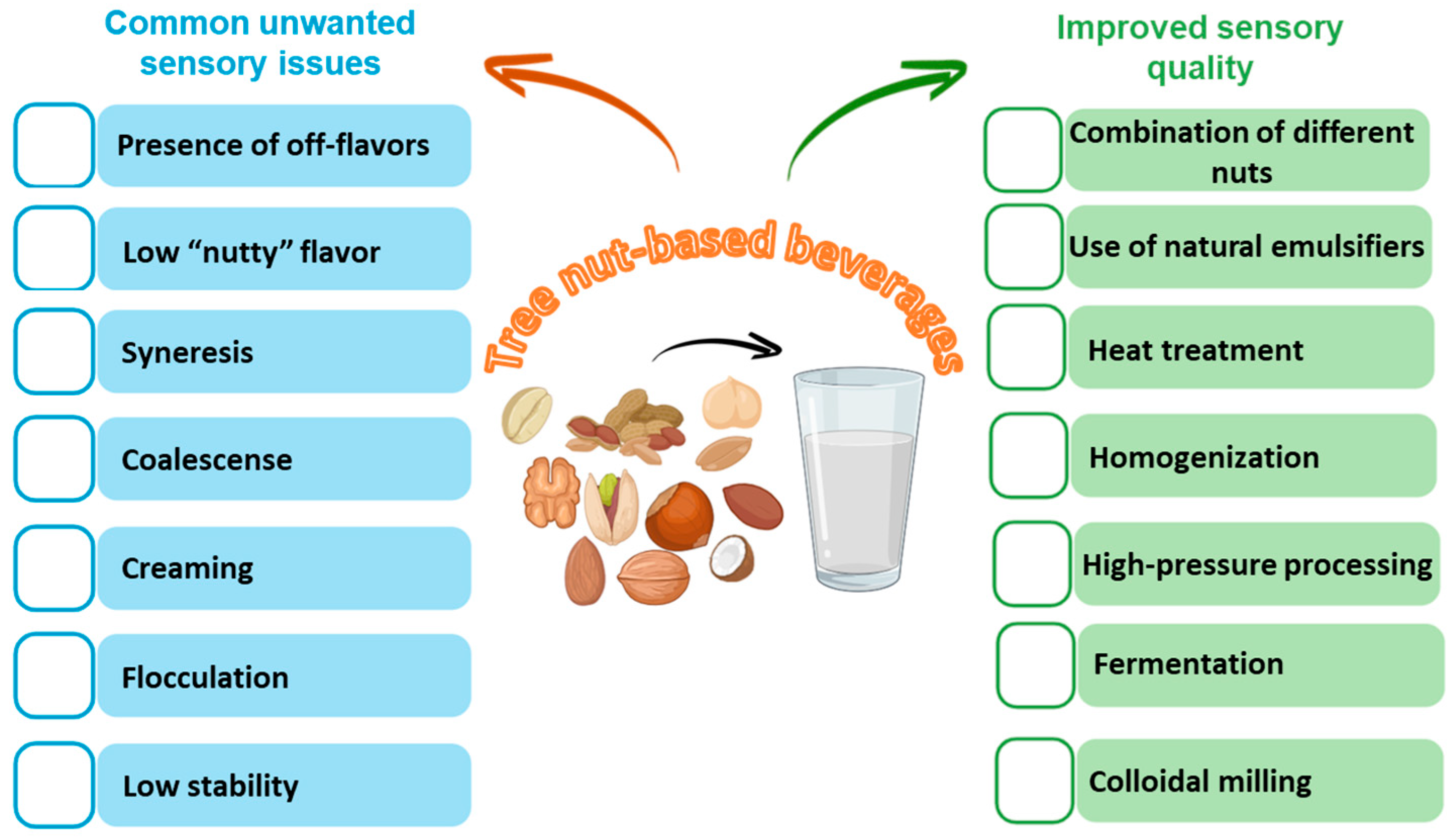 To address this instability and maintain a homogeneous appearance and texture, manufacturers commonly incorporate emulsifiers and stabilizers into the formulation. Additionally, the sensory profile of some tree nut-based beverages may be less appealing to certain consumers, who report bitterness, graininess, or other off-notes in taste and mouthfeel. At the same time, careful optimization of formulation and processing is necessary to ensure nutrient stability while preserving desirable sensory properties and emulsion stability.