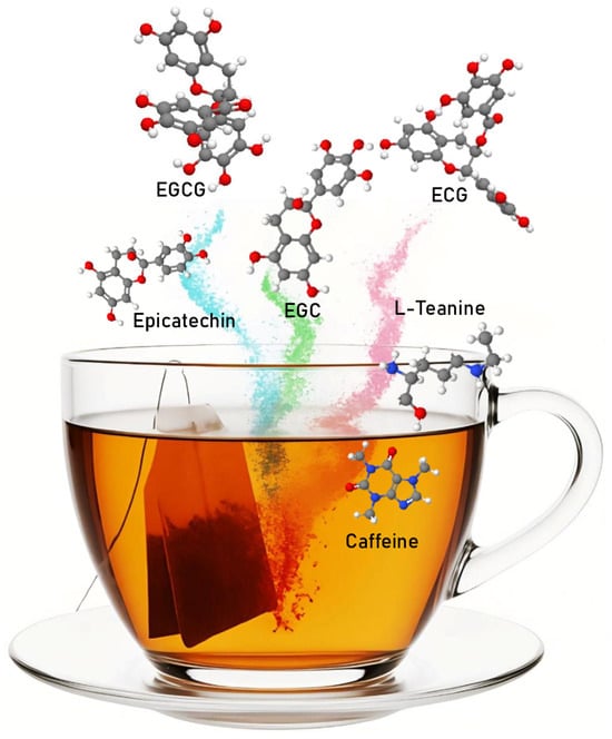 Tea contains a rich array of bioactive compounds, with its health effects largely attributed to polyphenols. Among polyphenols, flavonoids, particularly catechins, are the most abundant in green tea. Catechins such as epigallocatechin (EGC), epigallocatechin-3-gallate (EGCG), epicatechin (EC), and epicatechin-3-gallate (ECG) exhibit strong antioxidant activity, which helps neutralize free radicals and reduce oxidative stress [7,9,10,11]. These antioxidative properties have been linked to cardiovascular protection, anti-inflammatory effects, and weight management. Additionally, catechins demonstrate antimicrobial potential and contribute to liver health by mitigating oxidative damage [7]. Another key bioactive component is L-theanine, an amino acid found almost exclusively in tea. L-theanine promotes relaxation and cognitive alertness by influencing brain wave activity. It modulates neurotransmitters involved in stress regulation and attention, providing a calming effect without inducing drowsiness [7,18,19]. When combined with caffeine, a natural stimulant is also present in tea: L-theanine enhances cognitive performance and focus while reducing the jitteriness often associated with caffeine consumption [18]. In addition to these compounds, tea provides essential vitamins and minerals such as vitamin C, calcium, potassium, and magnesium. These nutrients contribute to immune function, bone health, and blood pressure regulation [7]. Although some processing methods may reduce the concentration of some of these components, their presence adds to the overall nutritional value of tea.