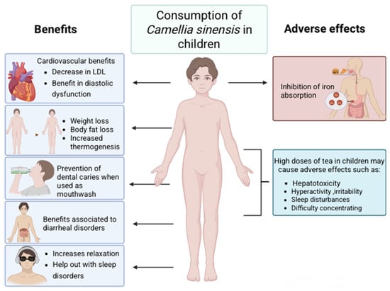 Finally, some of the evidence discussed in this narrative review has been obtained from adult populations and extrapolated to the children’s context. This approach must be interpreted with caution because physiological and metabolic differences between adults and children can significantly influence the absorption, distribution, and consequently, the effects of tea on the organism. Therefore, certain conclusions drawn from adult studies may not fully reflect the pediatric context, highlighting the need for child-specific research.