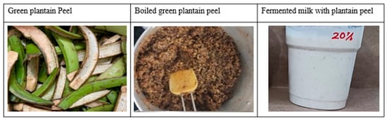 Images of green plantain peels after decoking and fermented milk added with decoction plantain peel.
