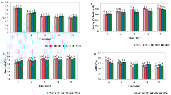 Ph (A), acidity (B), syneresis (C) and water retention capacity (WRC) (D) of FMC: fermented milk control treatment, FM5—fermented milk with 5% plantain peel added, FM10—fermented milk with 10% plantain peel added, and FM20—fermented milk with 20% plantain peel added. Different letters (a, b, c, d) indicate a statistical difference (Tukey test, p < 0.05) between all means over time.