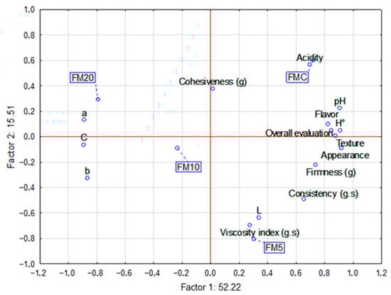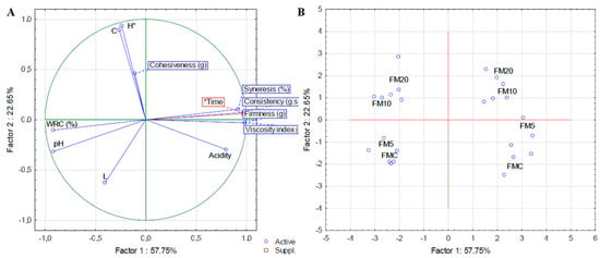 Color variation (∆E*) (Table 3) represents an estimate of the change in color of the samples over storage time with the control sample serving as a reference for comparation. Thus, when compared to the color of the first day of all treatments, samples FM10 and FM20 showed a significant difference (∆E > 4) [40], indicating a noticeable change in color variation. Storage time did not affect the color (p > 0.05), indicating a product with a stable color throughout storage. In the multivariate analysis, it was observed that over the course of storage time (factor 1, 57.75%), there was a reduction in pH, WRC, and L, and an increase in syneresis, consistency, firmness, and viscosity index (Figure 3A). In addition, there is a separation of samples by storage time (on the right: samples on day 21 of storage; on the left: samples on day 1). Furthermore, the FMC and FM5 formulations are grouped (bottom) (Figure 3B), as are the FM10 and FM20 formulations (top).