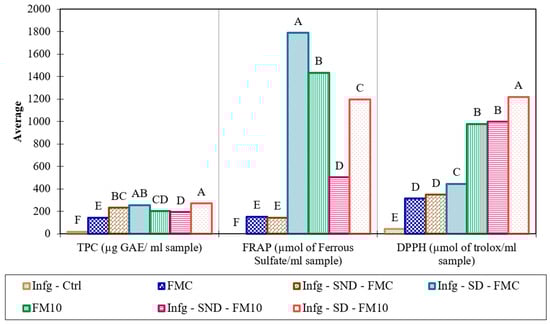 Total phenolic compounds (TPC) and antioxidant activity (FRAP and DPPH) in control fermented milk samples (FMC) and samples with added plantain peel (FM10), before and after INFOGEST in vitro digestion. Legend: Infg (INFOGEST); Infg-Ctrl (INFOGEST control); Infg-SND (sample of fermented milk subjected to the INFOGEST test, undigested (without the addition of enzymes); Infg-SD (sample of fermented milk subjected to the INFOGEST test, digested (with addition of enzymes)). Different letters (A, B, C, D, E, F) indicate a statistical difference between the means (Tukey test, p < 0.05).