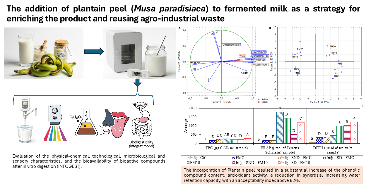 The plantain peel promoted the growth of lactic acid bacteria (LAB), although bacterial viability was reduced during storage. Notably, the FM10 sample maintained a similar count to the control at the end of storage. In sensory analysis, fermented milks with 5 and 10% peel (FM5 and FM10) were the most similar to the control, e and both were well accepted by tasters (82.2% and 82.5%, respectively). After in vitro digestion, the phenolic compounds and antioxidant activity in sample FM10 increased. Overall, incorporating green plantain peel into the production process presents a viable technological approach for creating fermented milk enriched with bioactive compounds, thereby contributing to waste reduction and enhancing the nutritional value of the product.