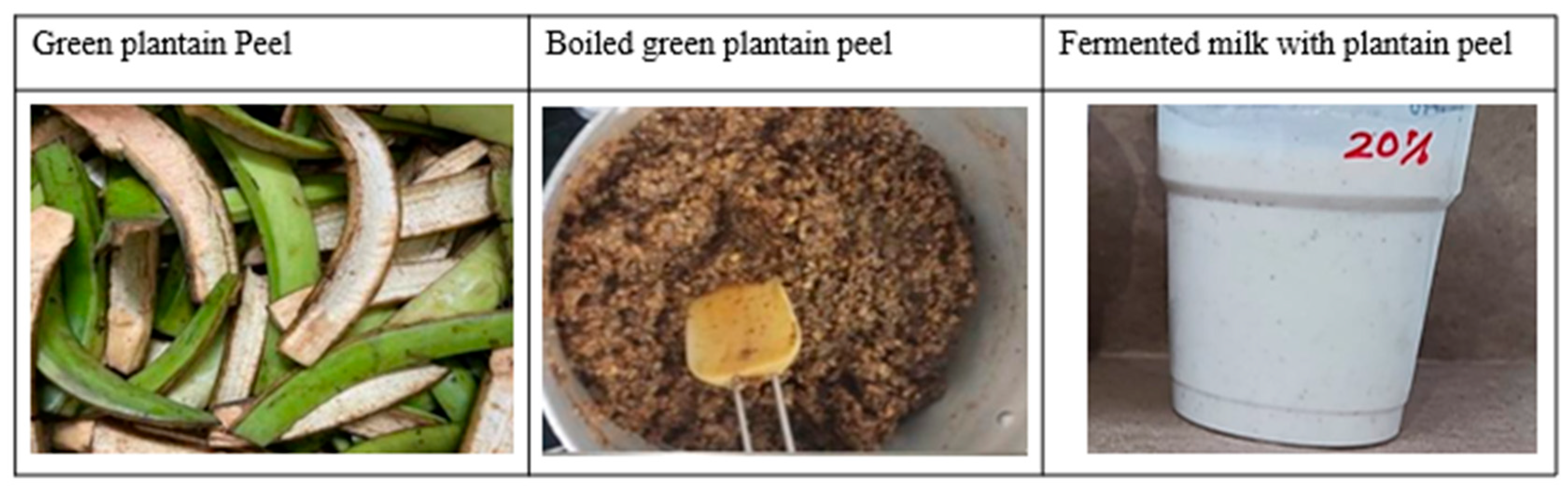 Furthermore, using fruit peels in food production helps to reduce waste, promotes sustainability, and fosters innovation, while supporting the circular economy and aligning with the UN’s Sustainable Development Goals (SDGs). Therefore, developing fermented milk enriched with bioactive compounds from green plantain peel, a by-product typically discarded during plantain chip production, could be an innovative product with high phenolic content [