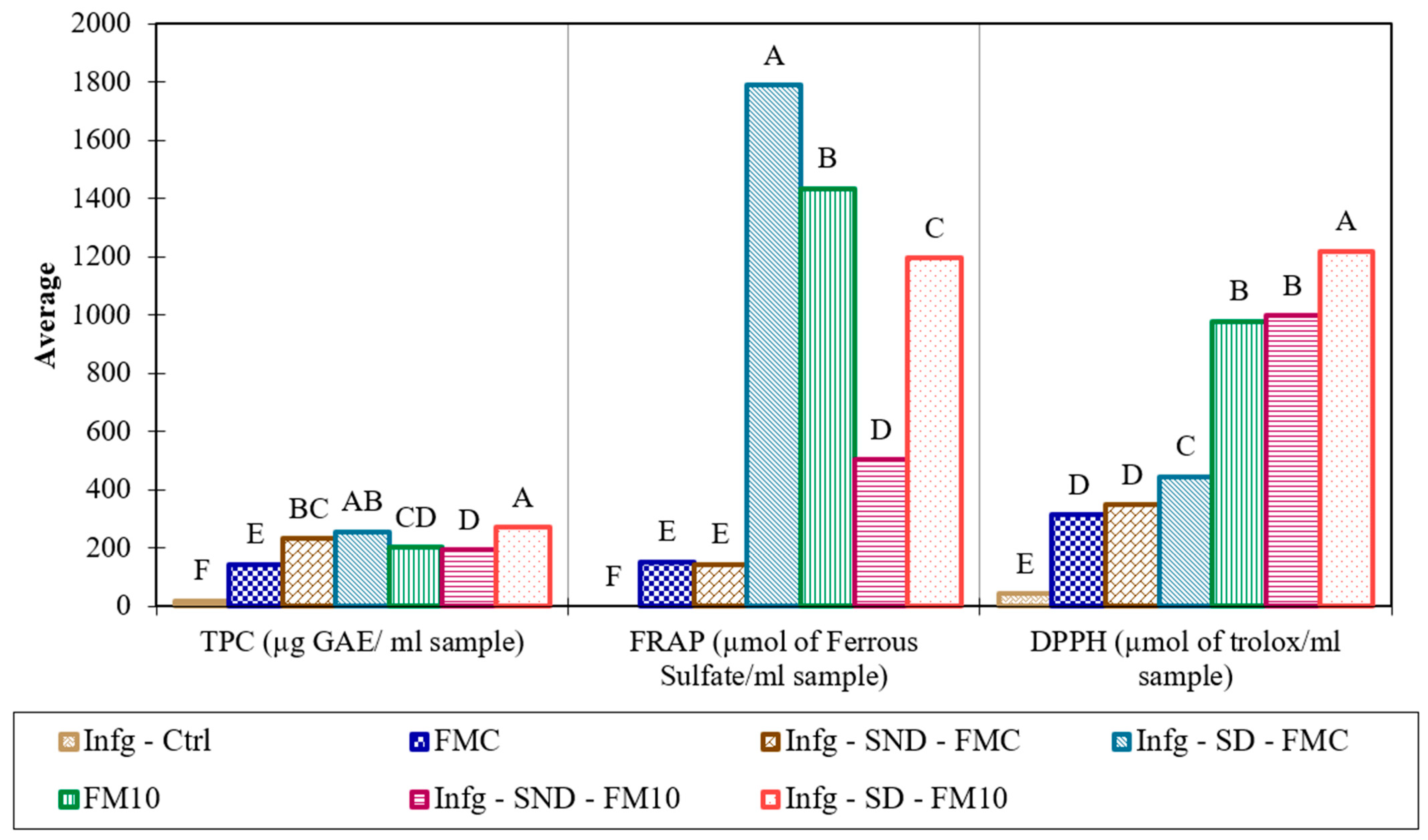 25]. In tubes, 90 μL of samples were transferred 270 μL of distilled water, 2.7 mL reagent FRAP (the reagent was prepared extemporaneously by mixing: (A) 300 mM acetate buffer (pH 3.6); (B) a 10 mM solution of TPTZ (2,4,6-Tris(2-pyridyl)-s-triazine) in 40 mM HCl; and (C) a 20 mM solution of iron (III) chloride. Solutions A, B, and C were combined in a 10:1:1 (