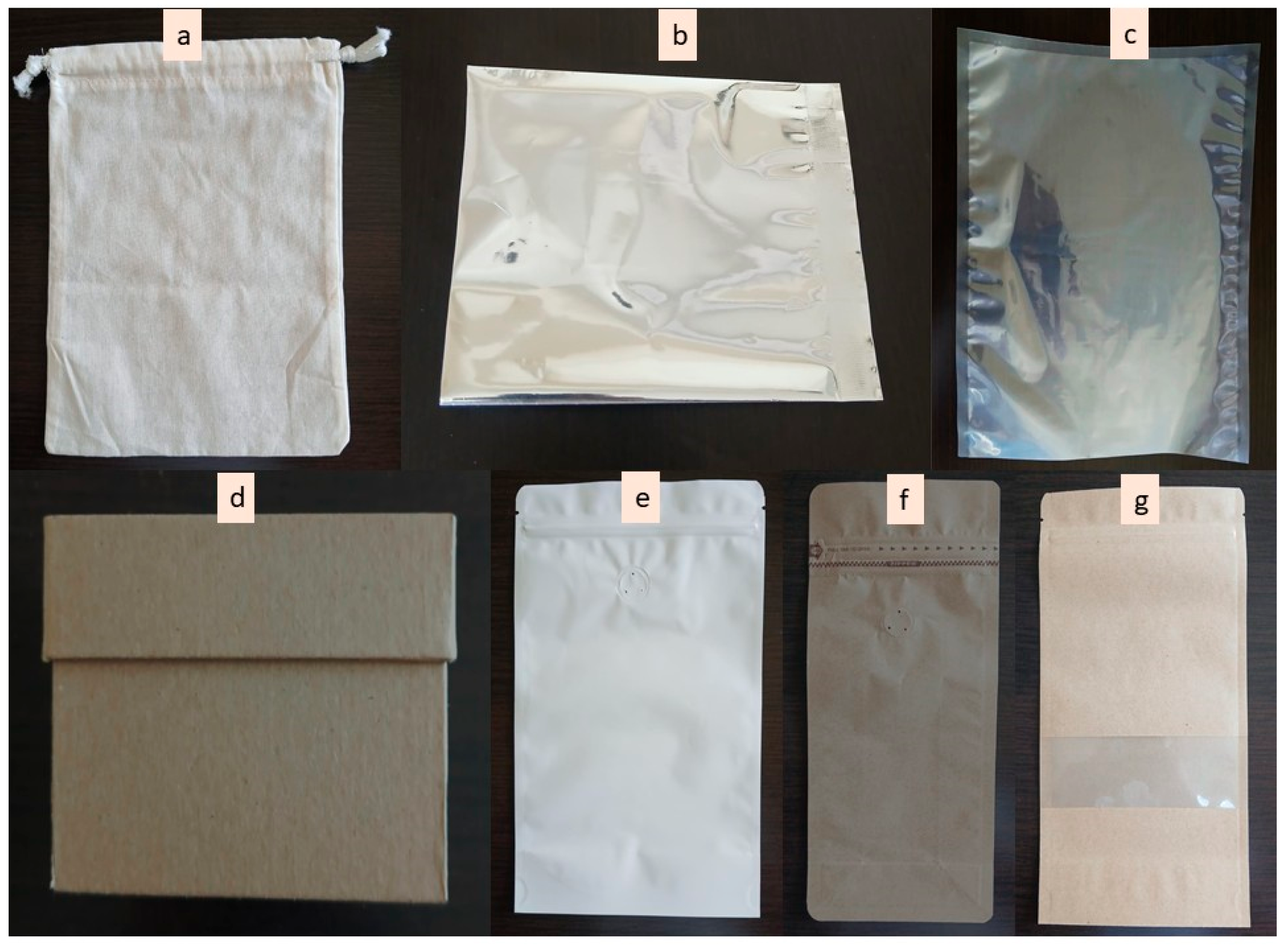 Note. TB: Tocuyo bag; DFAB: Double-laminated foil and aluminum bag; EV: Ecotac vacuum bag; PCB: Pressed cardboard bag; DBOZ: Double-laminated bag without valve, with opening and zipper; DBDVZ: Double-laminated bag with degassing valve and zipper; TBDVZ: Triple-laminated bag with degassing valve and zipper.