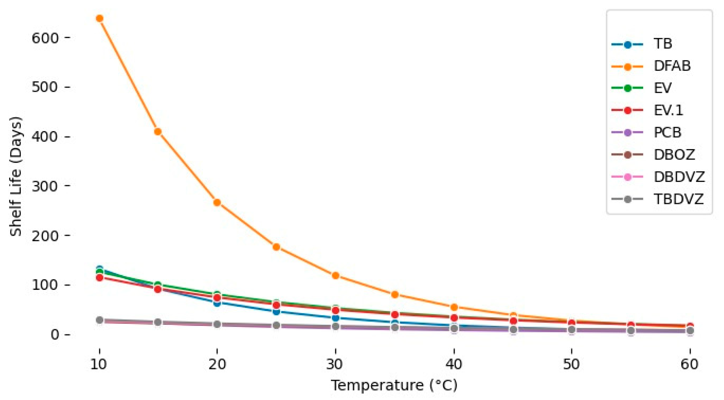 As illustrated in Figure 2, Table 8 presents the shelf life in days of coffee in its three forms, with different packaging strategies, for storage temperatures ranging from 40 to 60 °C. Green coffee beans have been demonstrated to be most effectively preserved in bilaminate foil and aluminum bags (BBFA), exhibiting prolonged stability for up to 55.13 days. The second-best option is vacuum packaging (VE), which has a shelf life of up to 35.21 days, while the least recommended option is storage in a tocuyo (BT), with 17.38 days.