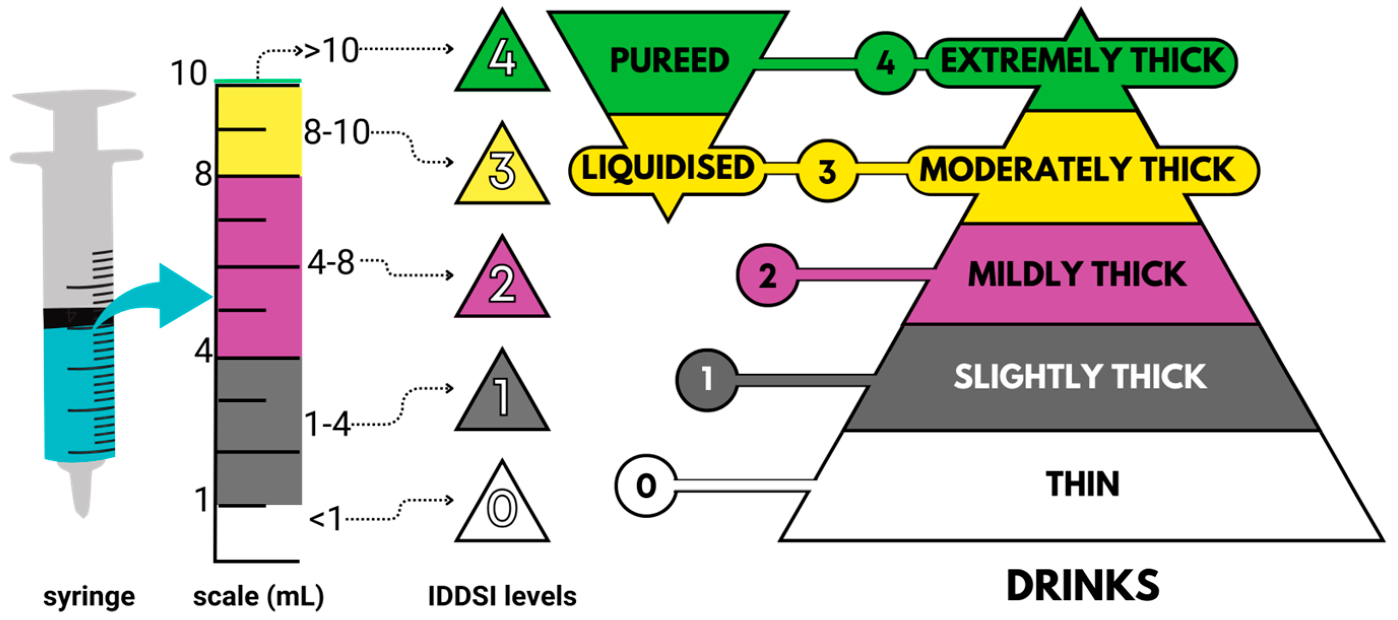 | Syringe | 0.6 g | IDDSI Level | 1.2 g | IDDSI Level | 2.4 g | IDDSI Level | Reference |