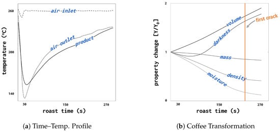 Example of (a) a time–temperature profile obtained by roasting under constant thermal load in a spouted bed roaster and (b) coffee’s subsequent physicochemical transformation during roasting.