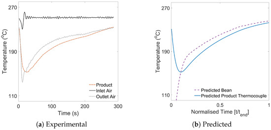 For implementation of the model, roast time was specified as 332 s and constant inlet air temperature as 482 °C. Air mass flow rate varies with thermocouple temperature, , such that for °C, = 43 kg s−1, when °C, and when °C, . The heat transfer effectiveness factor was specified as 0.3. Air-to-bean heat transfer area was specified as 48 m2. Although air mass flow rate varies with time, there was insufficient data to define a correlation between air velocity and air mass flow rate, so air velocity was set to be constant at 4 m s−1 [43].