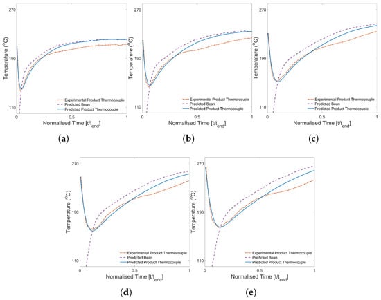 As the thermal response coefficient, K, increases, the thermocouple’s response time decreases, thus reducing the time and temperature of the ‘turning point’ (the time–temperature profile’s global minimum). The difference between the predicted temperatures of the thermocouple and the bean ( and in Figure A9, respectively), which can be considered as the RMSE if is the reference, decreases as K increases. Therefore, for thermocouples with higher values of K (i.e., with smaller diameters), the response is more rapid and accurate, relative to the predicted bean temperature—so as . The effect of airflow, bean bed dynamics and the temperature within the roasting chamber on the thermal response coefficient is sensible, as all of these will influence heat transfer rates from the system (i.e., the beans and the air) to the thermocouple. Conversely, this shows that for large diameter thermocouples with low values of K, the temperature measured by the thermocouple is expected to be delayed relative to the ‘thermal reality’ of the system.