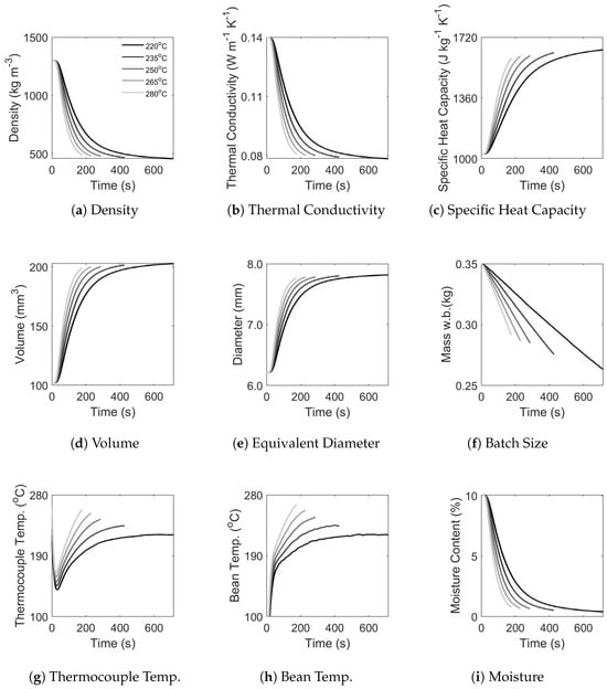 Air thermal conductivity, specific heat capacity, air density and dynamic viscosity were constant, with values extracted from Engineering-ToolBox [64]: 4.04 × 10−2 W m−1 K−1, 1029.5 J kg−1 K−1, 0.4567 kg m−3, 2.67 × 10−5 kg m−1 s−1. Bean diameter was 6 mm and initial moisture content 0.111 kg kg−1. The bean’s thermal conductivity, , and specific heat capacity, , were a function of moisture content, (; ) [43]. Initial bean temperature was 18.3 °C, batch size 400 kg and dry matter mass assumed constant. Heat generation from exothermic reactions was a function of an apparent activation energy () where A = 116,200 kJ kg−1, = 5500 K, = 232 kJ kg−1 and initial heat generation is zero, i.e., = 0 kJ kg−1. Latent heat of vaporisaiton was = 2790 kJ kg−1 and the moisture loss was a kinetic model (). Bean temperature was a function of the thermocouple temperature (), where K = 0.013 s−1. Initial thermocouple temperature was 253 °C.