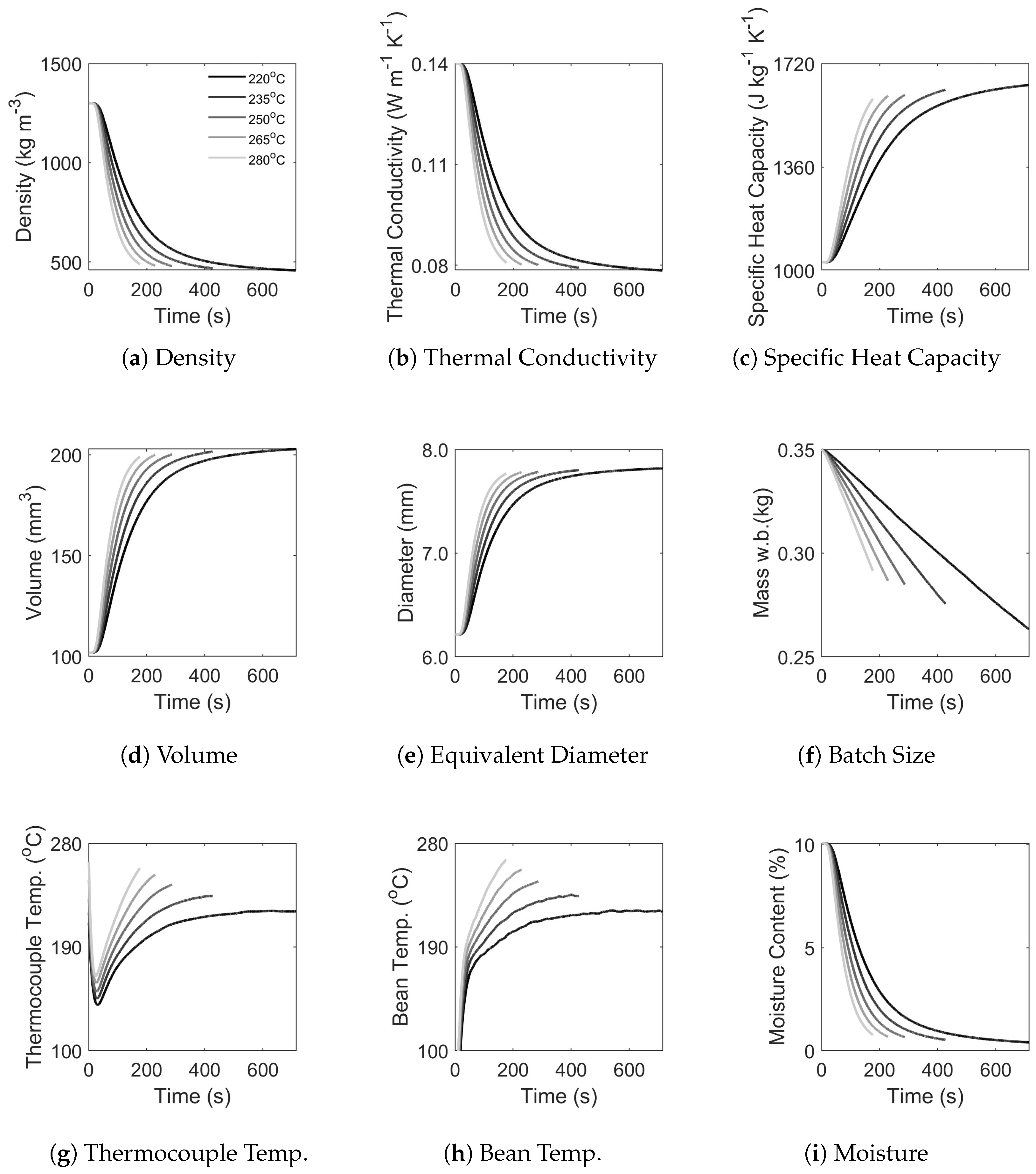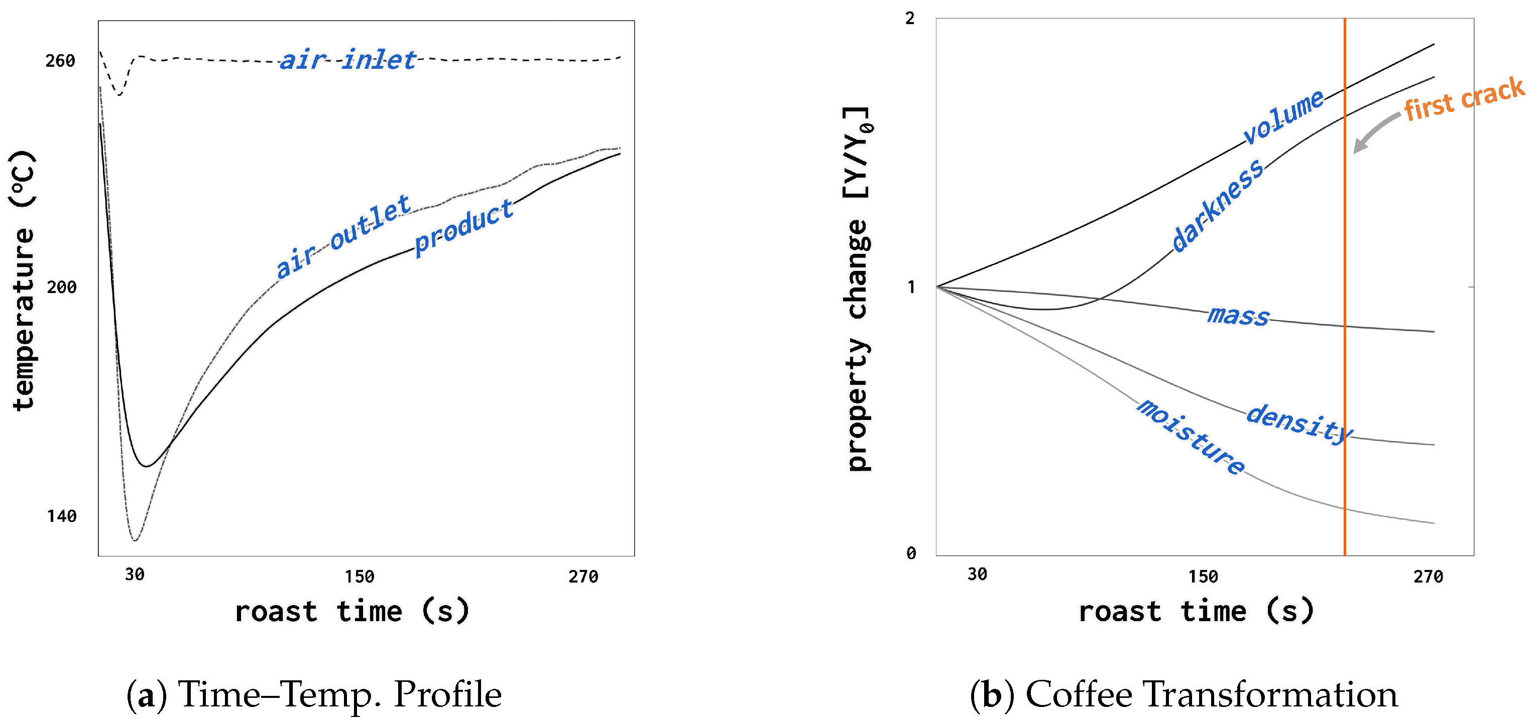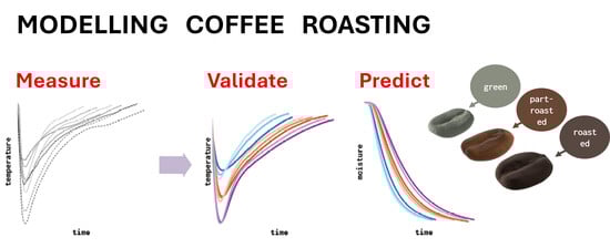 - Uren, K.R.; Vosloo, J.; van der Merwe, A.F.; van Schoor, G. Heat and mass transfer modeling of an artisan coffee roasting process: A comparative study. Dry. Technol. 2023, 41, 1697–1713. [Google Scholar] [CrossRef]